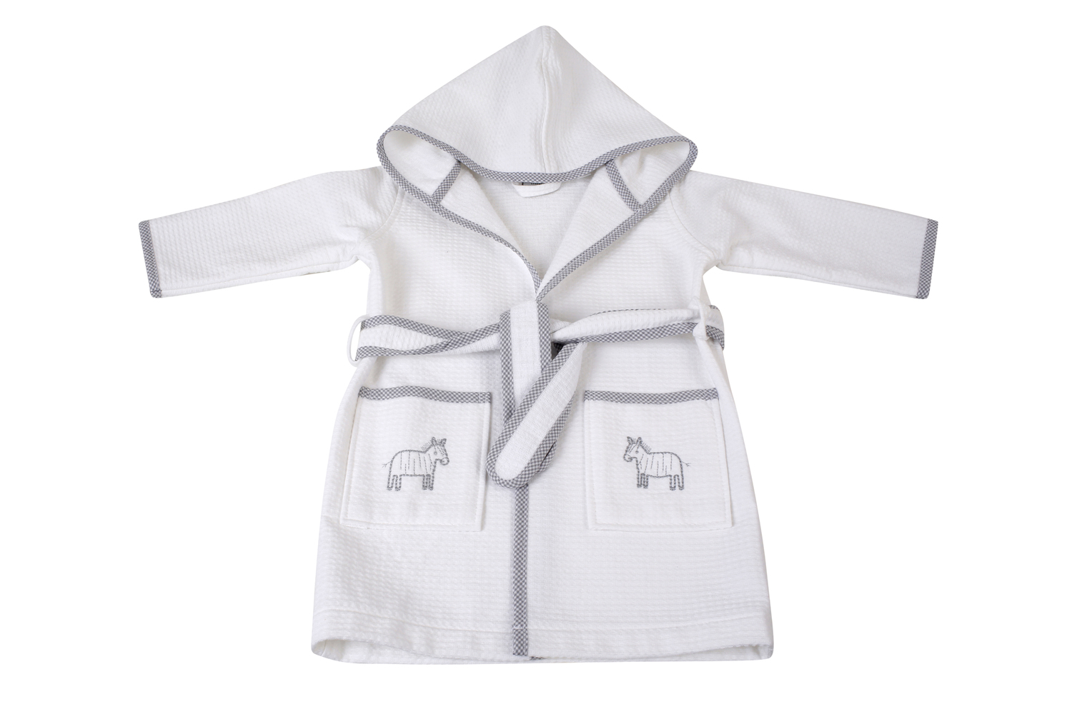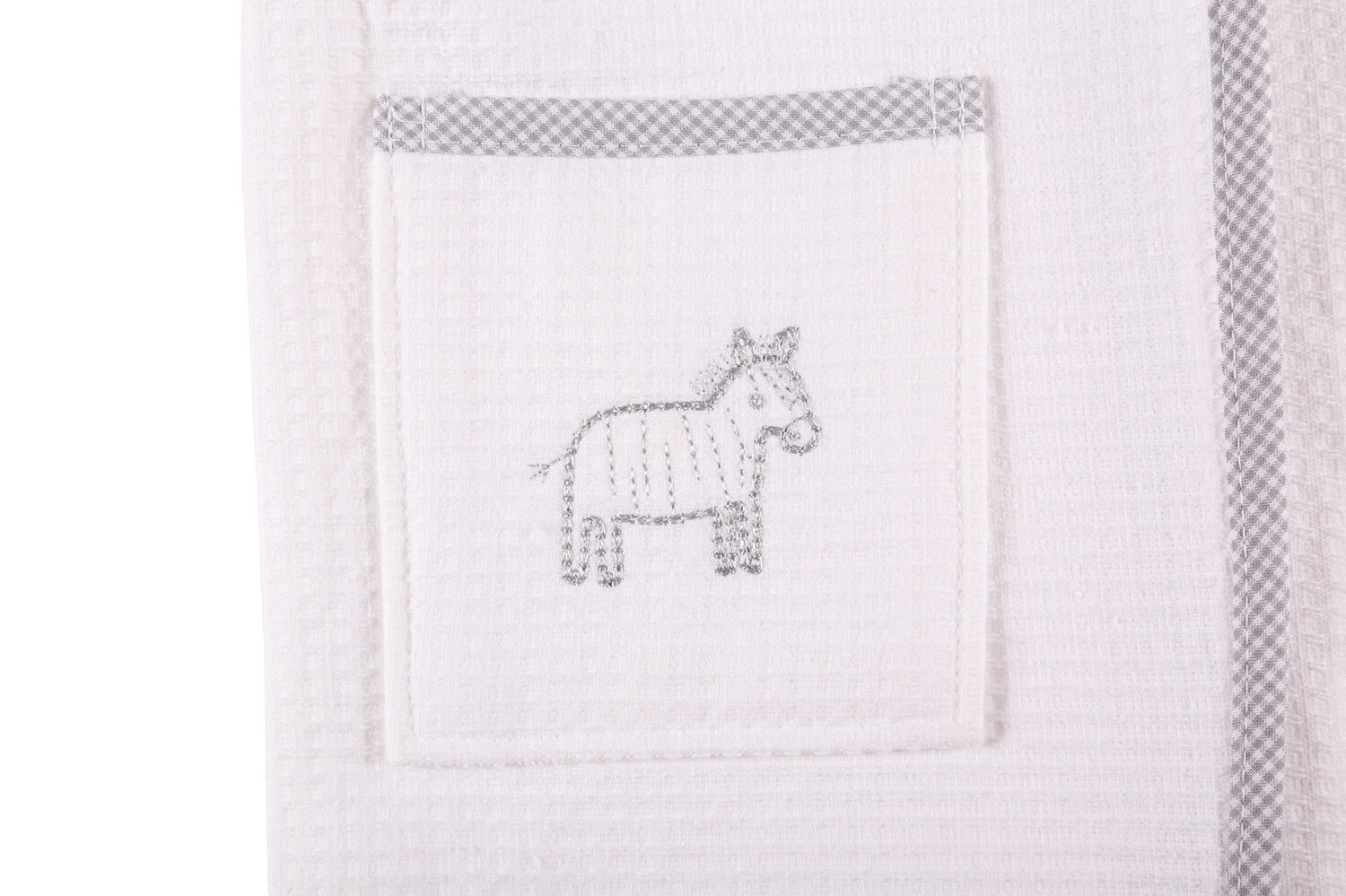 - Grey gingham trim and with a baby Zebra embroidery design on the pockets