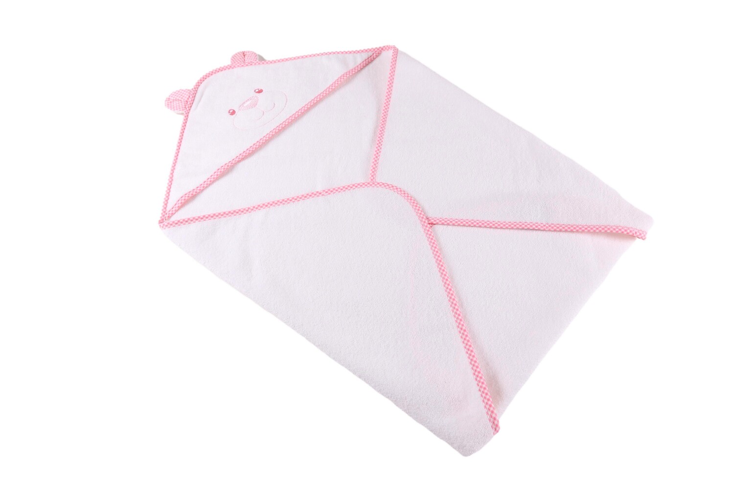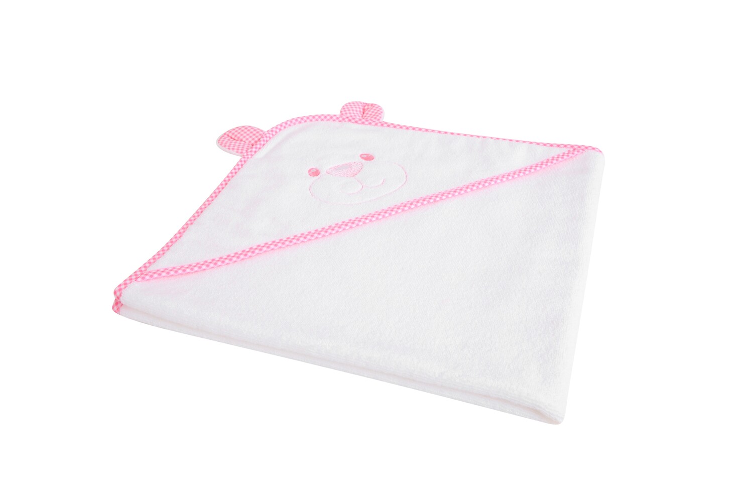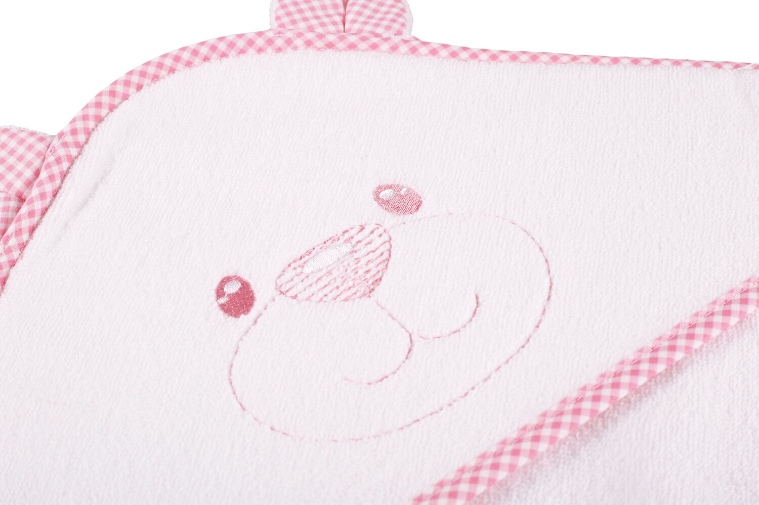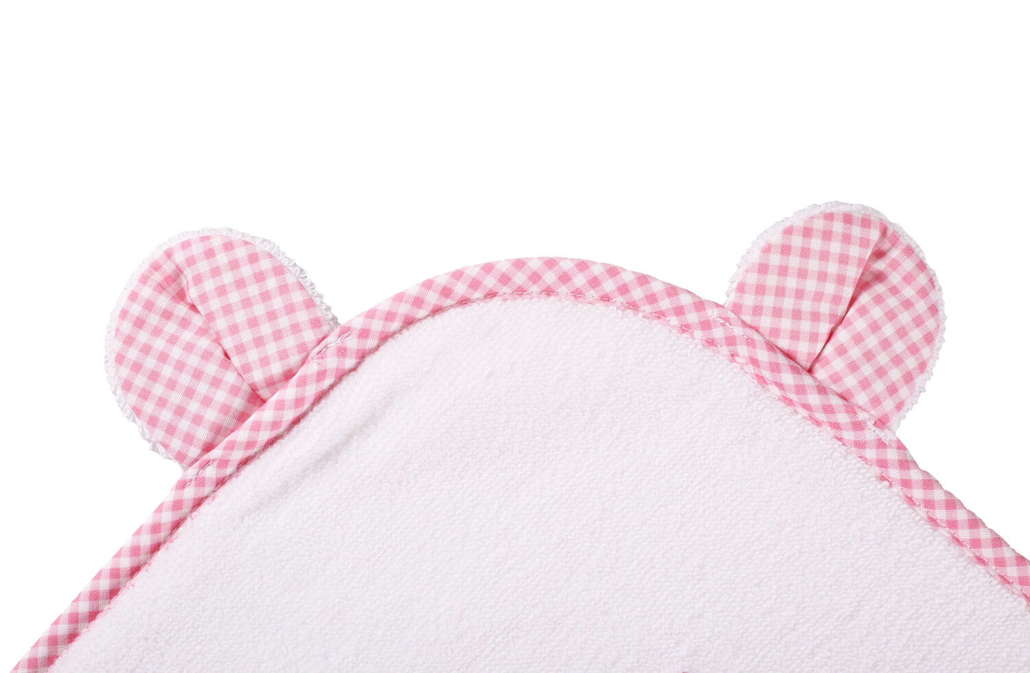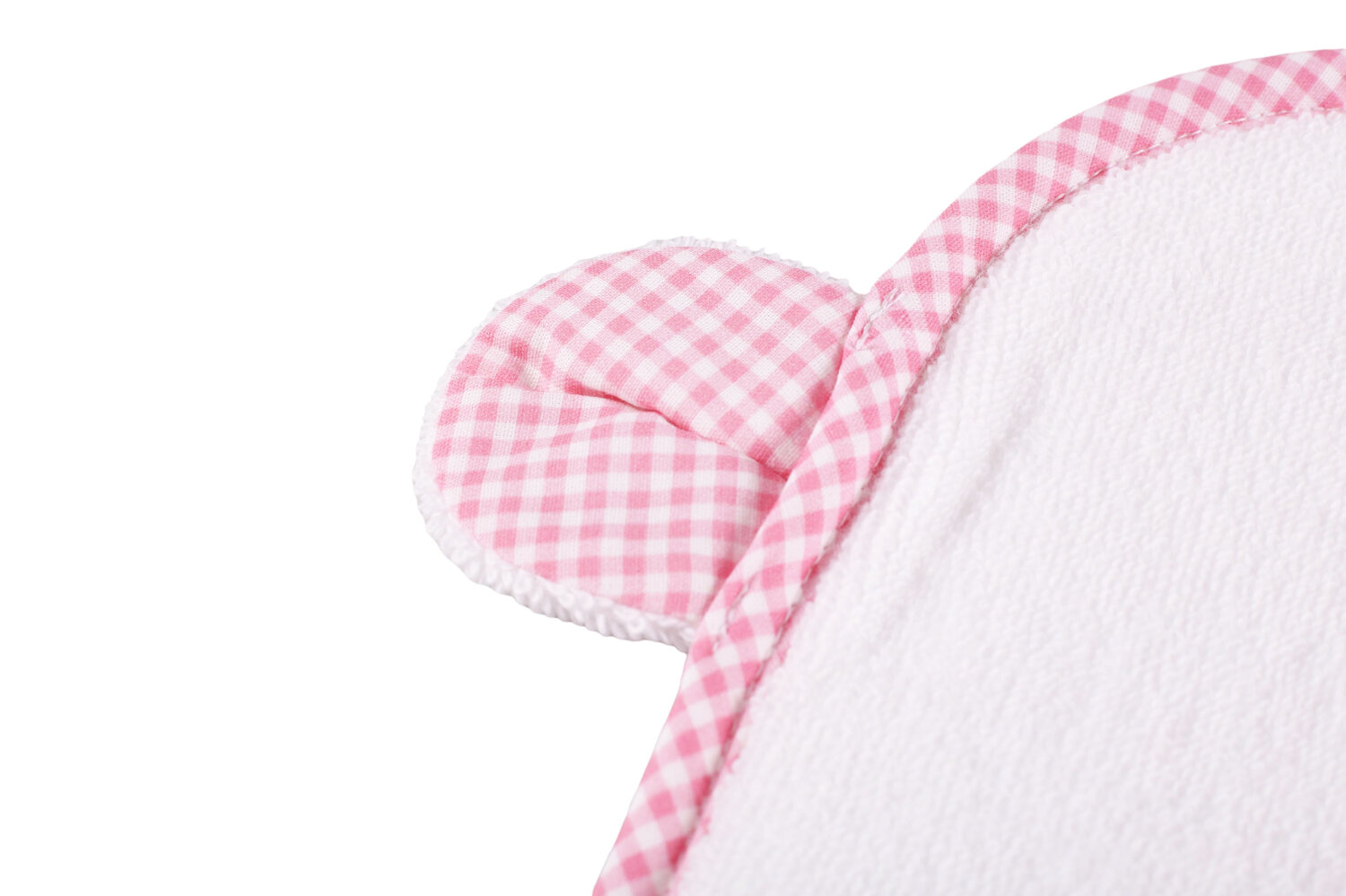 A wonderful soft low twist combed cotton hooded towel with a cute teddy bear embroidery and pink gingham trim. This adorable white luxury hooded towel provides a very soft feel against your little ones skin. Perfect for cuddling and drying your little ones after bath time. Thick terry towel will keep your little ones warm and cosy.